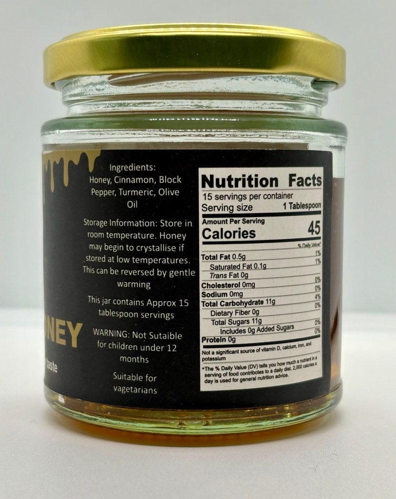 Golden Honey is a carefully crafted blend of raw, unprocessed honey infused with turmeric, extra-virgin olive oil, cinnamon, and black pepper—each ingredient chosen for its powerful healing properties. Turmeric is renowned for its potent anti-inflammatory and antioxidant compounds (curcumin), which help reduce chronic inflammation linked to arthritis, joint pain, and even support brain health by fighting oxidative stress. Black pepper contains piperine, which dramatically increases turmeric’s absorption, making its benefits more effective. Extra-virgin olive oil is rich in heart-healthy monounsaturated fats and polyphenols that help lower bad cholesterol, improve cardiovascular health, and protect skin from premature aging. Cinnamon is well-known for its ability to regulate blood sugar levels, making it beneficial for people with diabetes or insulin resistance, and it also has antimicrobial properties that support oral and digestive health. Together, this golden elixir supports immune system strength, reduces the risk of infections, soothes digestive issues like bloating and indigestion, promotes healthy circulation, and provides natural relief from everyday inflammation and oxidative stress. Perfect for daily use, Golden Honey is a delicious and natural way to support your overall health and protect against common chronic diseases.