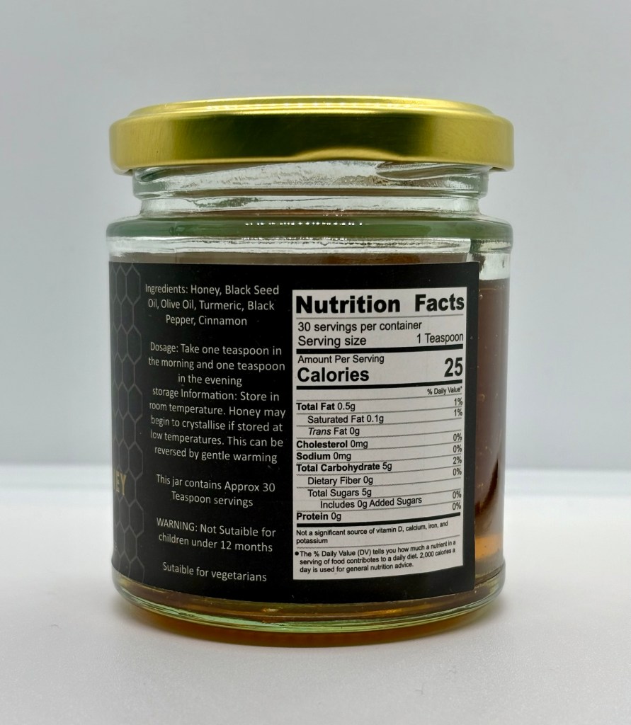 Healing Honey is a potent natural blend of raw honey, turmeric, olive oil, black seed oil, black pepper, and cinnamon, formulated to support your health and protect against a variety of conditions. Turmeric’s anti-inflammatory and antioxidant effects help reduce joint pain, soothe sore throats, and combat oxidative stress. Black seed oil is especially known for supporting respiratory health by preventing asthma attacks, easing bronchial inflammation, and reducing allergy symptoms. Olive oil promotes heart health, improves circulation, and nourishes the skin, while black pepper enhances digestion and increases absorption of turmeric’s benefits. Cinnamon helps regulate blood sugar and has antimicrobial properties. This combination soothes tonsillitis, strengthens the immune system against colds and flu, diminishes inflammation linked to arthritis, aids digestion, and supports lung health. Additionally, the blend’s natural anti-inflammatory and immune-modulating effects may help reduce allergic reactions and seasonal allergy symptoms, promoting clearer breathing and relief from congestion. As with any natural product, those with known allergies to bee products or spices should consult a healthcare professional before use.